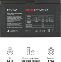Блок питания 650W Azerty RPA-650BA2 ATX, 12CM FAN, 20+4p ,CPU(8pin), 2*PCI-E(6+2), 4* SATA, 2* Molex